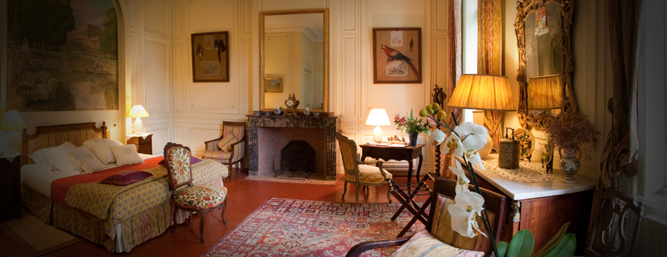 Ornée de peintures panoramiques des Jardins de Versailles, la chambre Jaune est grande et lumineuse avec vue sur le parc et la serre. Elle se situe au 1er étage du château.